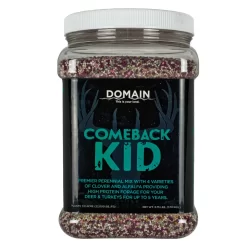 LOADED WITH A MIXTURE OF COLD SEASON PERENNIALS AND ANNUALS, THIS PROTEIN-RICH, TONNAGE PRODUCING CLOVER MIX IS DESIGNED FOR YEAR-ROUND FOOD PRODUCTION AND ATTRACTION FOR DEER AND TURKEY. BY COMBINING SPECIAL VARIETIES OF CLOVER AND ALFALFA WE HAVE CREATED A PERENNIAL MIX THAT WILL ESTABLISH QUICKLY AND LAST UP TO 5 YEARS. COMEBACK KID CONTAINS 4 SPECIAL VARIETIES OF CLOVER AND 1 VARIETY OF ALFALFA TO CREATE AN ABSOLUTE DEER MAGNET PROVIDING FORAGES WITH PROTEIN LEVELS ABOVE 30%. WHEN YOUR CLOVER PLANTS BEGIN TO FLOWER IT SIGNALS THEIR MATURITY, MAKING IT A GREAT TIME TO MOW THE PLOT DOWN TO 6-8”. PERIODIC MOWING HELPS ELIMINATE UNWANTED WEEDS AND GENERATES RE-GROWTH OF THE CLOVER AND ALFALFA, KEEPING THEM STRONG AND HEALTHY. IT’S DURING THIS GROWTH STAGE THAT YOUR COMEBACK KID FOOD PLOT WILL PROVIDE THE HIGHEST LEVEL OF NUTRITION AND DEER ACTIVITY. COMEBACK KID IS DESIGNED TO BE THE FOUNDATION OF YOUR FOOD PLOT PROGRAM, AS IT PROVIDES THE BACKBONE OF DEER NUTRITION WITH IT’S HIGH PROTEIN FORAGES, WILL BE THE FIRST TO GERMINATE IN THE SPRING AND IS EXTREMELY COLD TOLERANT INTO THE DEAD OF A NORTHERN WINTER…COMEBACK KID CAN PLAY AN INTEGRAL ROLE IN THE HEALTH OF YOUR HERD AND THE SUCCESS OF YOUR FOOD PLOT PROGRAM.